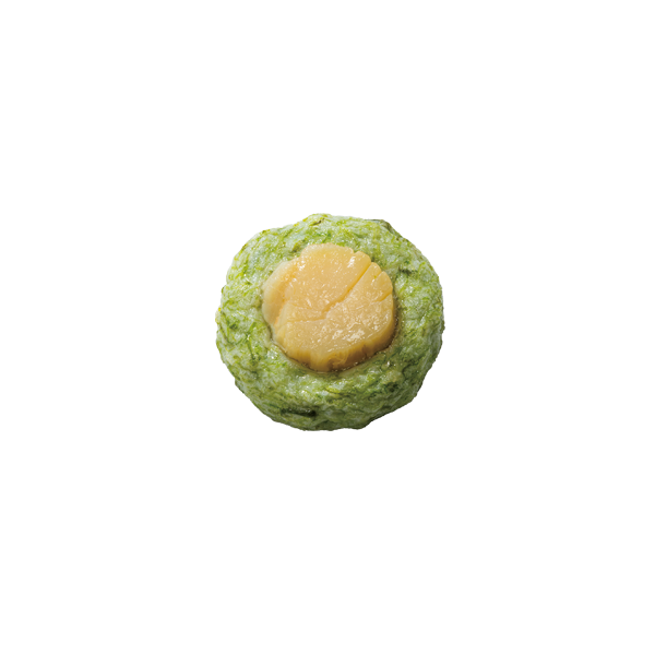 青のりやわかめなどたっぷり練り込んだグリーンのすり身の上に、ホタテを丸ごとドンとのせた贅沢な天ぷらです。