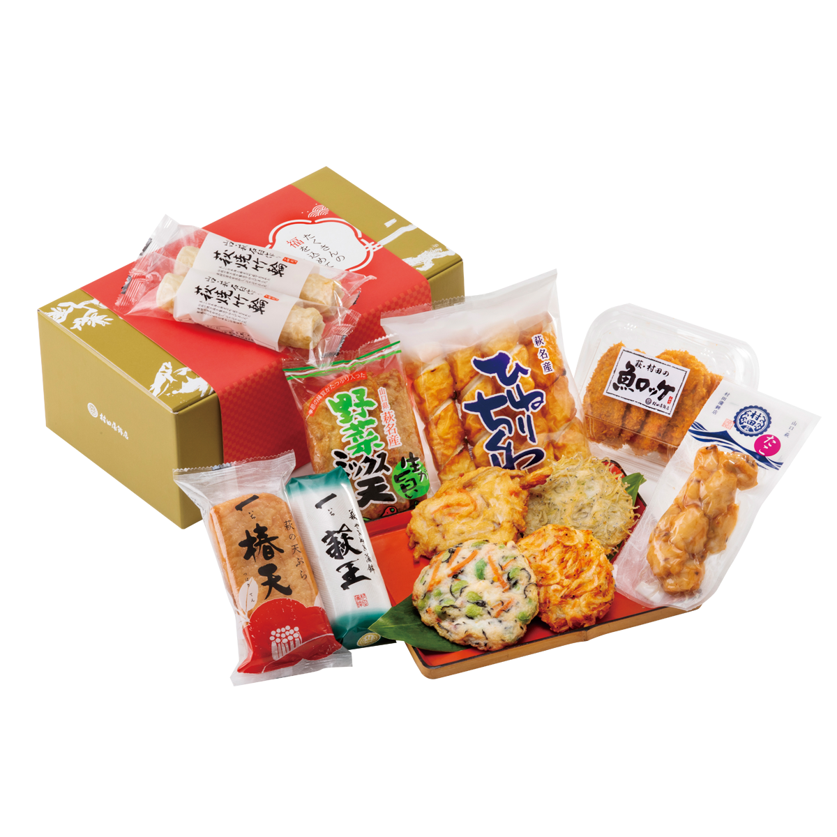 一萩王 小(白)×1本/一椿天(3枚入)×1袋/野菜ミックス天×1袋/ひねりちくわ×1袋/萩焼竹輪×2本/たこちぎり天×1個/魚ロッケ(5枚入)×1パック/惣菜天(枝豆五目天、いかごぼうかき揚げ天、大漁ちりめん天、桜えび天)×各1枚