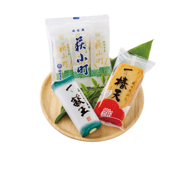 | 原材料 | 【一萩王】魚肉(タラ、エソ、グチ)、卵白(卵を含む)、食塩、砂糖/調味料(アミノ酸等)、保存料(ソルビン酸) 【萩小町】魚肉、卵白、食塩、砂糖、でん粉、魚介エキス、みりん/調味料(アミノ酸等)、保存料(ソルビン酸) 【一椿天】魚肉(タラ(輸入)、エソ)、でん粉、卵白(卵を含む)、食塩、砂糖、魚介エキス、灰持酒、植物油脂/調味料(アミノ酸等)、保存料(ソルビン酸)、甘味料(甘草、ステビア) |
